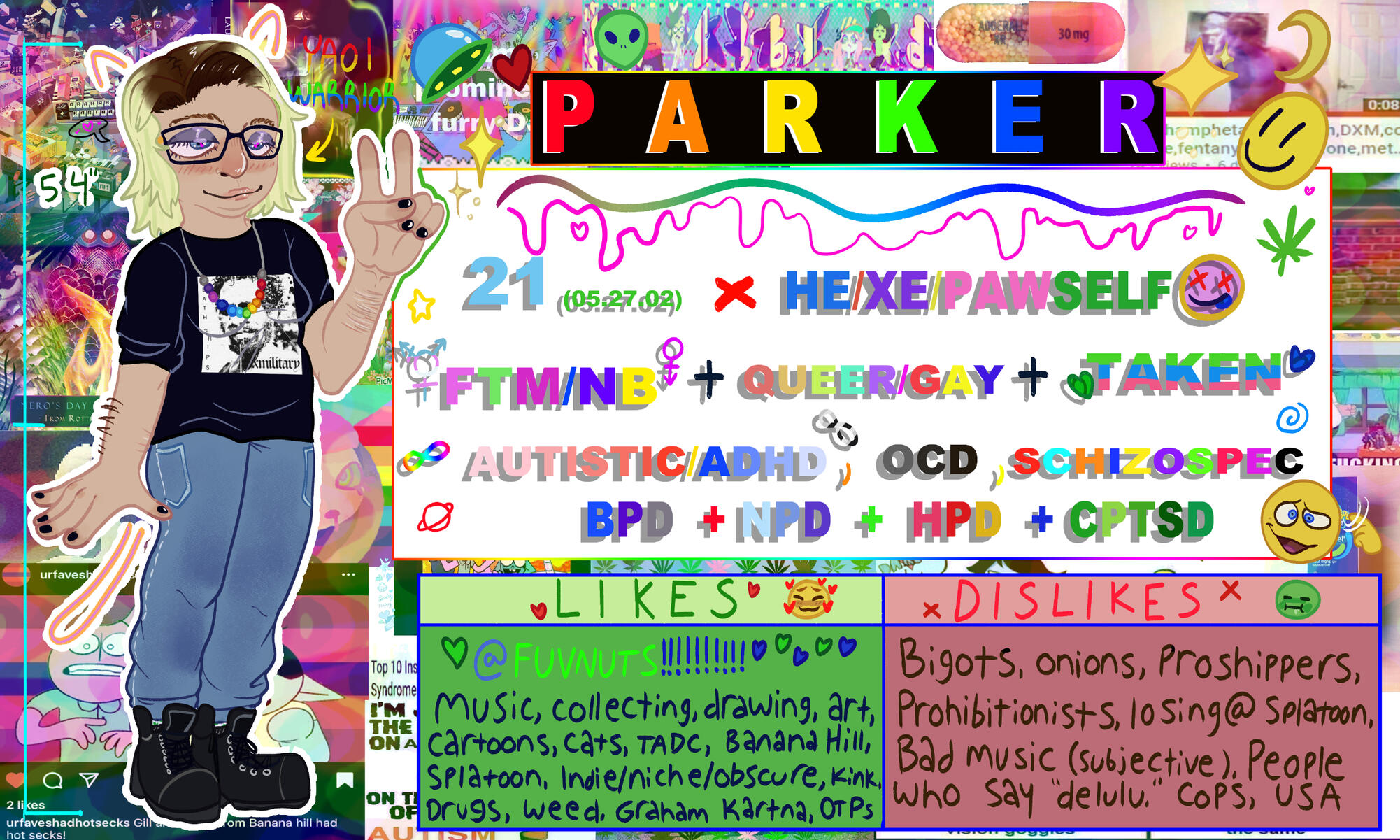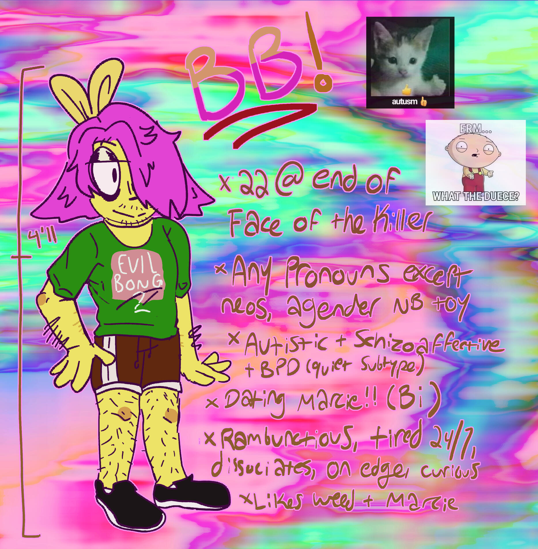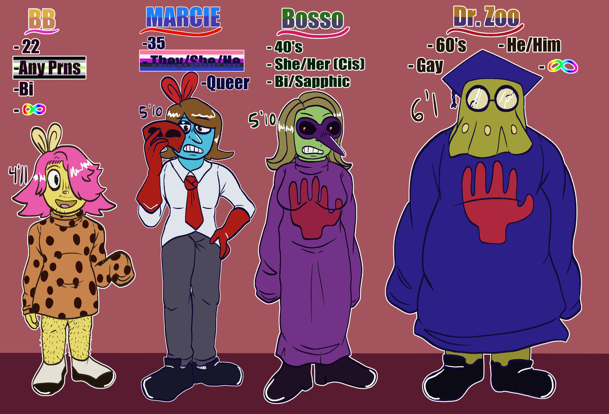 FOR THESE, SPECIFY WHAT INFO YOU WANT (DEFAULTS: NAME, PRONOUNS) SUCH AS AGE, PERSONALITY TRAITS, LIKES/DISLIKES, ETC ETC ETC.